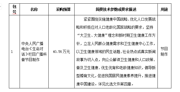 中国健康教育中心就 “中央人民广播电台《生命对话》栏目广播科普节目制作”进行比选采购,现邀请合格供应商参加比选响应。
