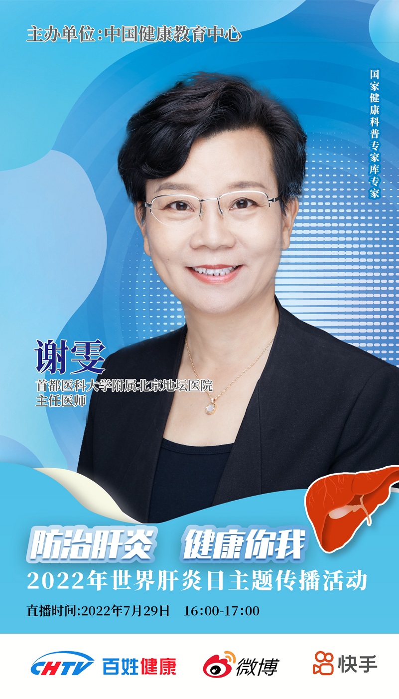 世界肝炎日期间,中国健康教育中心将主办系列健康传播活动。7月29日下午16:00-17:00将邀请首都医科大学附属北京地坛医院谢雯主任医师和首都医科大学附属北京佑安医院刘梅主任医师,两位国家健康科普库的专家,就大家关注的病毒性肝炎、肝硬化防治问题进行线上访谈。欢迎收看。