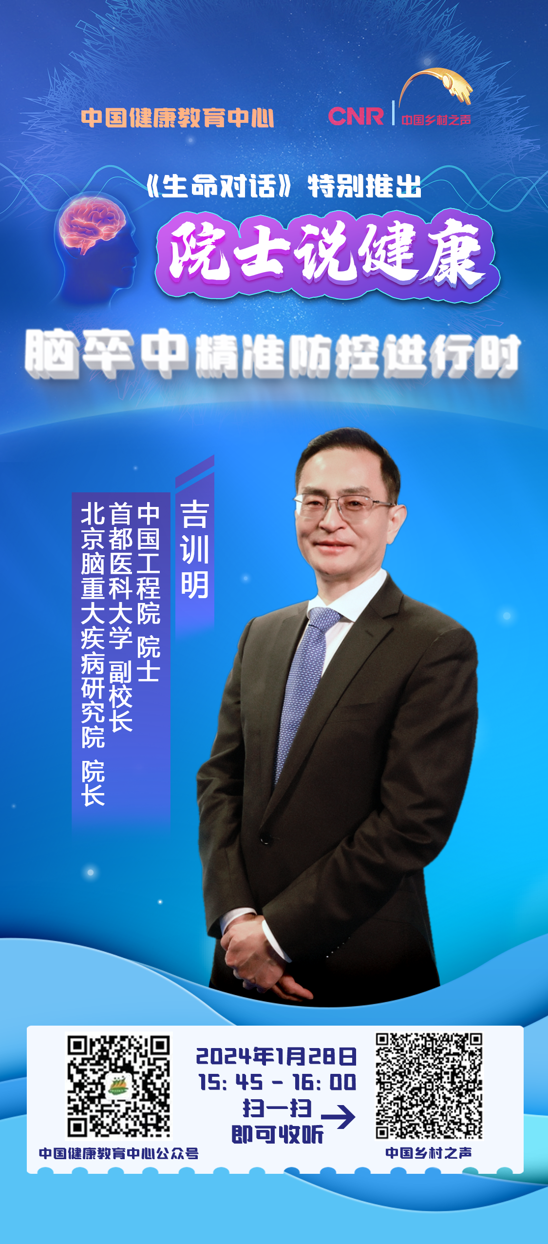 由中国健康教育中心制作的《生命对话》栏目,特别推出《院士说健康》特别节目,邀请中国科学院院士、北京大学第六医院院长陆林院士,为听众带来《良好睡眠 健康之源》,邀请中国工程院院士、首都医科大学副校长、北京脑重大疾病研究院院长吉训明院士,为听众带来《脑卒中 精准防控进行时》,欢迎收听。